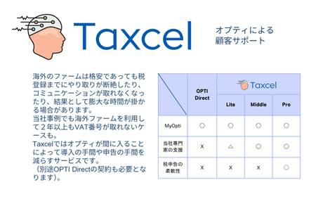 Taxcelは英語でのやり取りが不安な方や短時間でのUnion-OSS登録を目指すプランです。海外ファームとのやり取りは対応に時間が掛かり、Union-OSS登録までに1年-2年以上時間が掛かるケースがあります。Taxcelはオプティ側の専門家が入ることでスムーズ且つ比較的短期間でのUnion-OSS登録を実現するものです。
