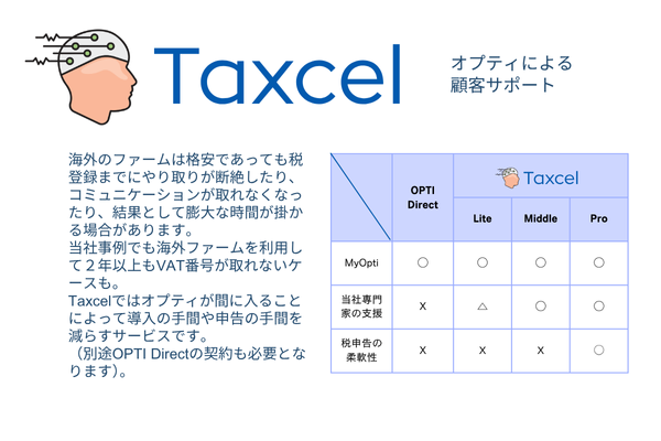 Taxcelは英語でのやり取りが不安な方や短時間でのVAT登録を目指すプランです。海外ファームとのやり取りは対応に時間が掛かり、VAT登録までに1年-2年以上時間が掛かるケースがあります。Taxcelはオプティ側の専門家が入ることでスムーズ且つ比較的短期間でのVAT登録を実現するものです。