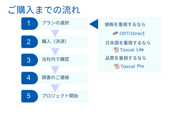 お客様ご自身で対応いただく内容はOPTI Directと同様ですが、当社の提携する外注先が貴社との窓口となり日本語での対応が可能となります。支援内容については、翻訳がメインとなります。